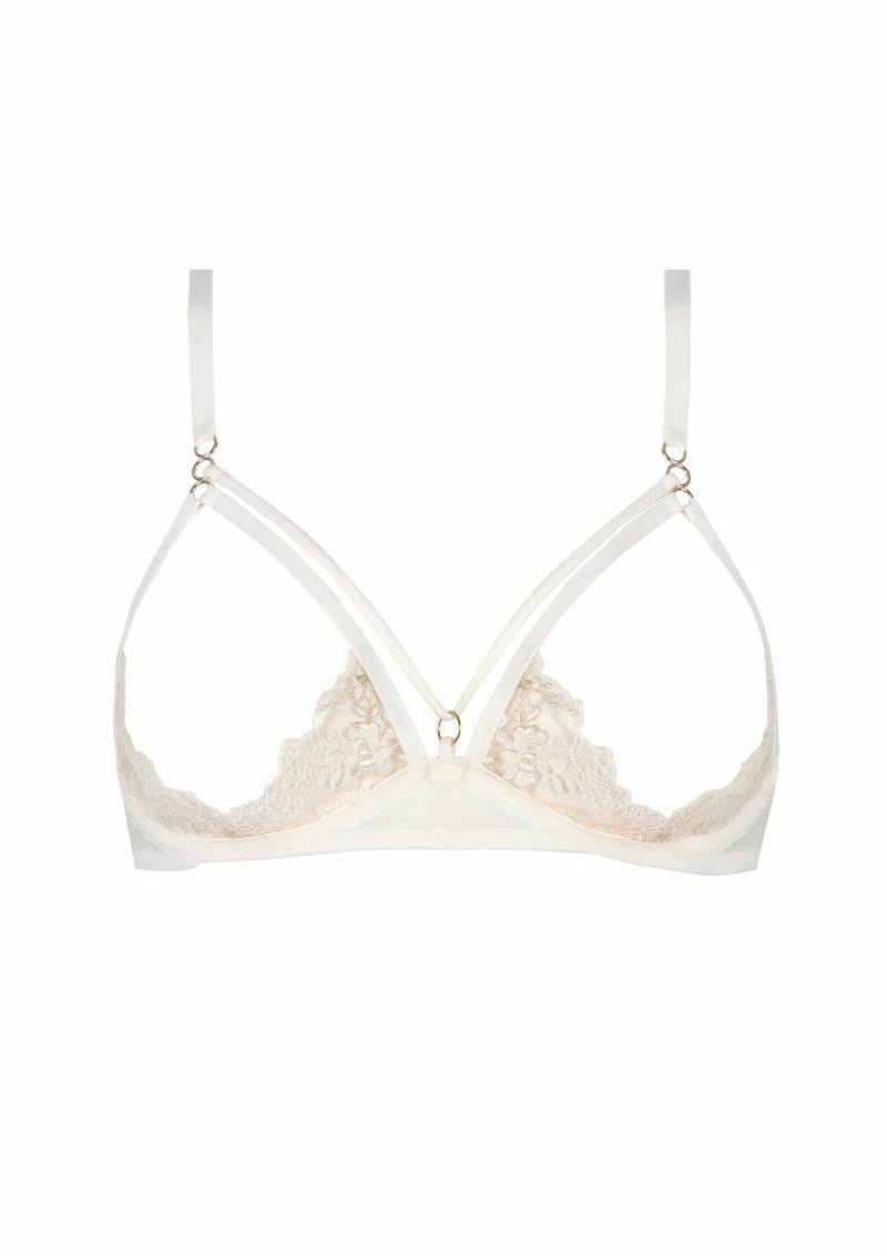 De Après Minuit Open Bra – Ivory verleidt met doorschijnende ivoorkleurige tule, subtiel geborduurd met glinsterende draden. Deze bh met open cups onthult een gedurfde transparantie en omarmt de buste met Parijse elegantie. Luxueuze stoffen en verfijnde details maken het tot een opvallend statementstuk binnen de Après Minuit-collectie, perfect voor verleidelijke avonden.