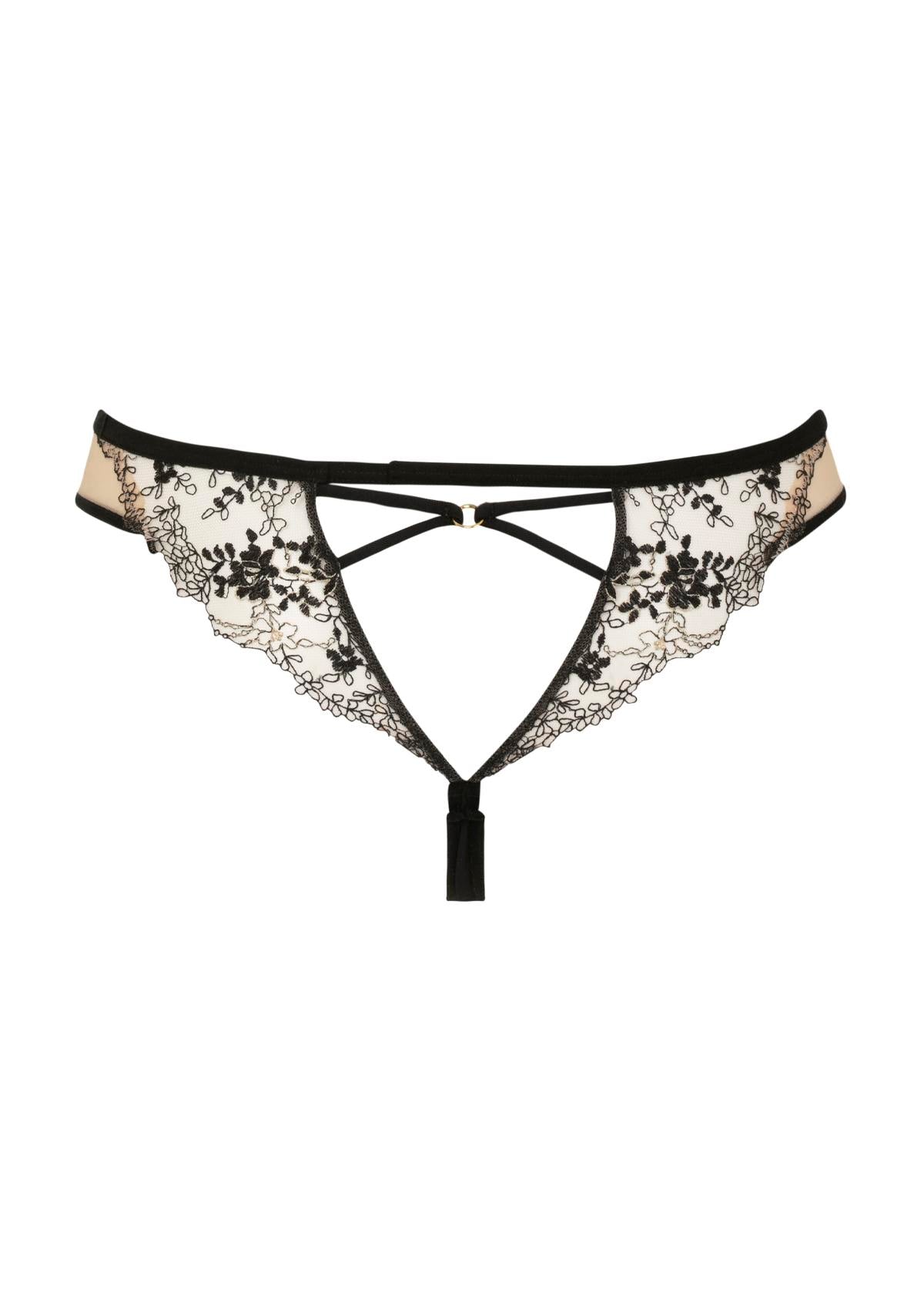 De Après Minuit Tanga – Zwart verleidt met doorschijnende zwarte tule, subtiel geborduurd met glinsterende draden. Deze tanga is ontworpen met een flatterende snit die een gedurfde transparantie biedt en omarmt de heupen met Parijse elegantie. Luxueuze stoffen en verfijnde details maken het tot een opvallend statementstuk binnen de Après Minuit-collectie, perfect voor verleidelijke avonden.