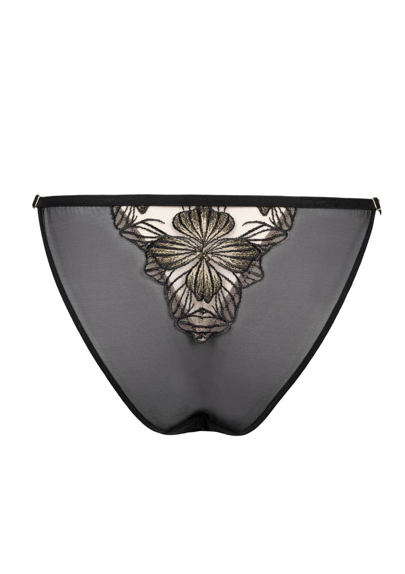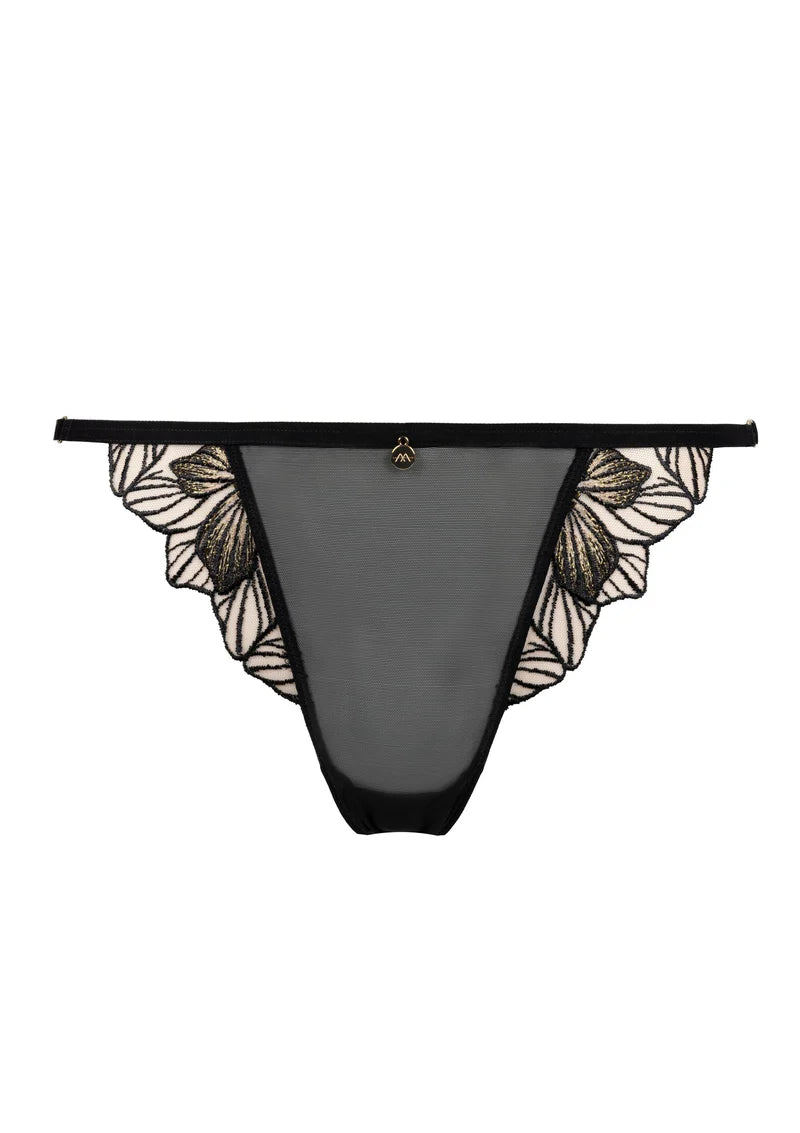 De Fleur Défendue slip combineert verfijnde transparantie met sensuele zwarte bloemenborduursels op een nude basis. De elegante borduursels accentueren de heupen op een verleidelijke manier, terwijl de zachte tule achterkant zorgt voor comfort en lichtheid. Subtiele gouden accenten en een delicaat juweeldetail maken dit geraffineerde stukje Parijse verleiding compleet.