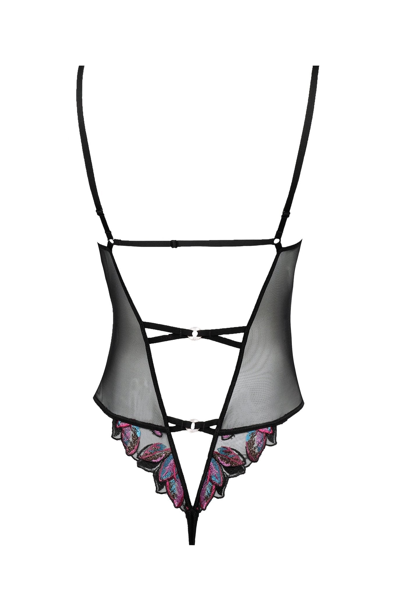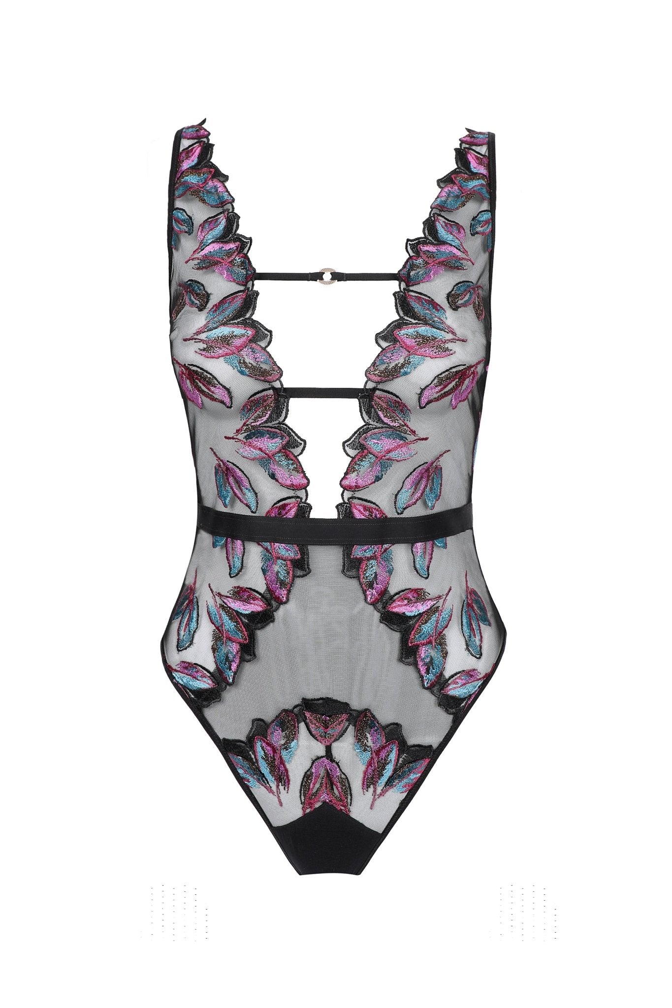 De Oiseau de Paradis Bodysuuit – Black verleidt met doorschijnende zwarte tule, subtiel geborduurd met exotische bloemenmotieven. Ontworpen met een diepe V-hals en verfijnde details, onthult deze body met gedurfde transparantie het silhouet en accentueert het de elegantie van Parijs. Luxueuze stoffen en voortreffelijk vakmanschap maken het tot een opvallend statementstuk binnen de Oiseau de Paradis-collectie, perfect voor betoverende avonden.