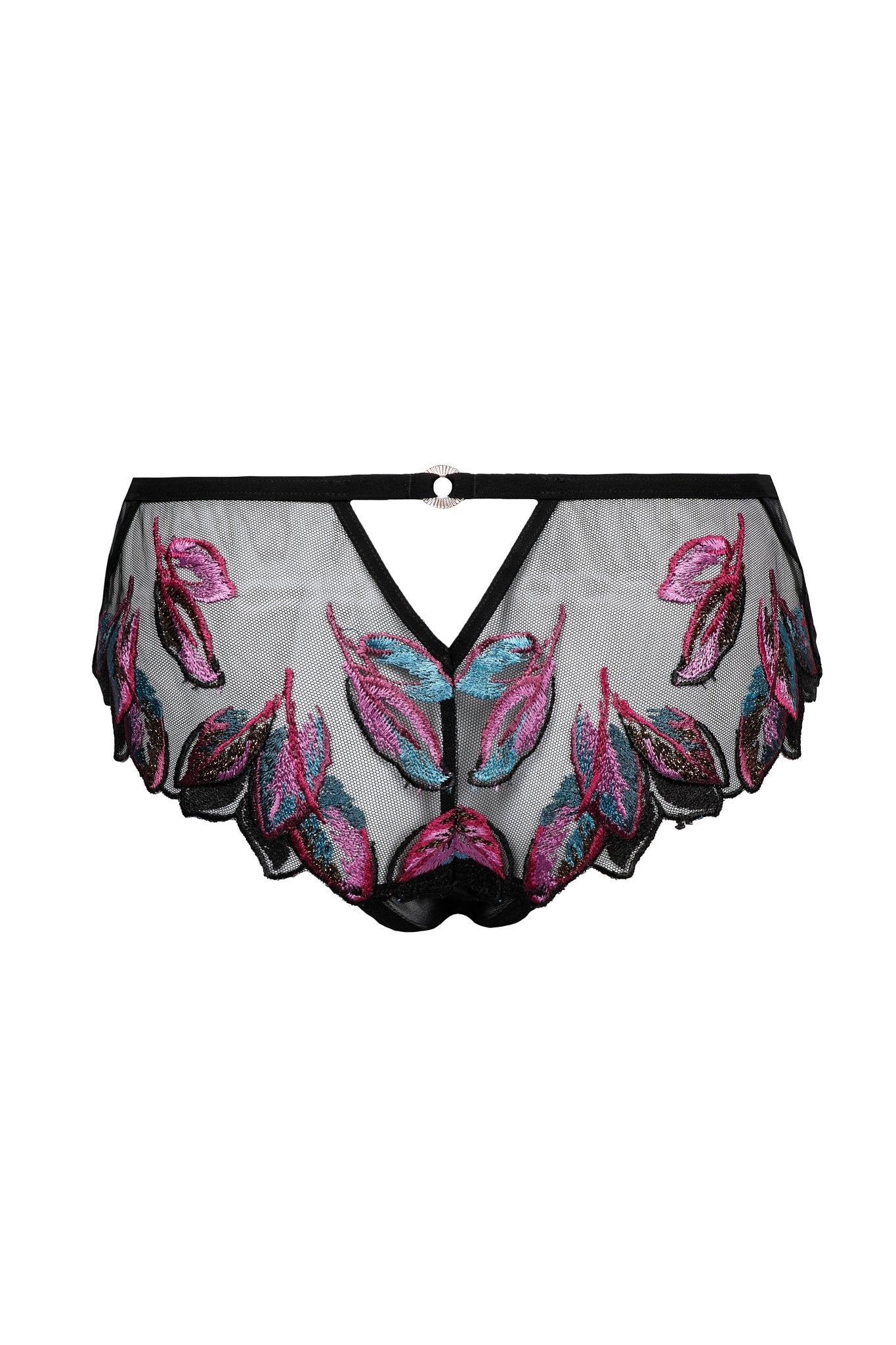 Oiseau de Paradis slipje – Zwart verleidt met doorschijnende zwarte tule, subtiel geborduurd met exotische bloemmotieven. Ontworpen met een flatterende snit die verfijnde transparantie biedt, omarmt dit slipje de heupen met Parijse elegantie. Luxueuze stoffen en verfijnde details maken het tot een opvallend statementstuk binnen de Oiseau de Paradis collectie, perfect voor verleidelijke avonden.