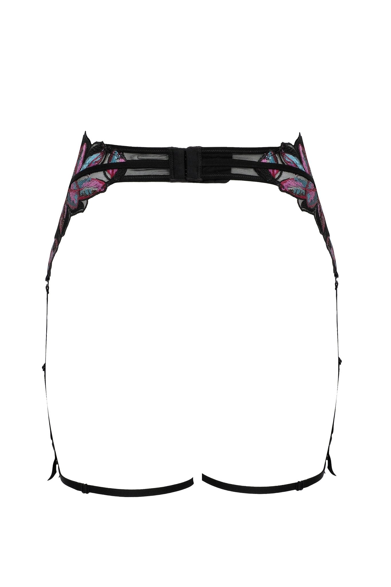 Oiseau de Paradis Jarretel – Zwart verleidt met doorschijnende zwarte tule, subtiel geborduurd met exotische bloemmotieven. Ontworpen met verstelbare bandjes en verfijnde details, omarmt deze jarretel de taille met gedurfde transparantie en Parijse elegantie. Luxueuze stoffen en voortreffelijk vakmanschap maken het tot een opvallend statementstuk binnen de Oiseau de Paradis-collectie, perfect voor verleidelijke avonden.
