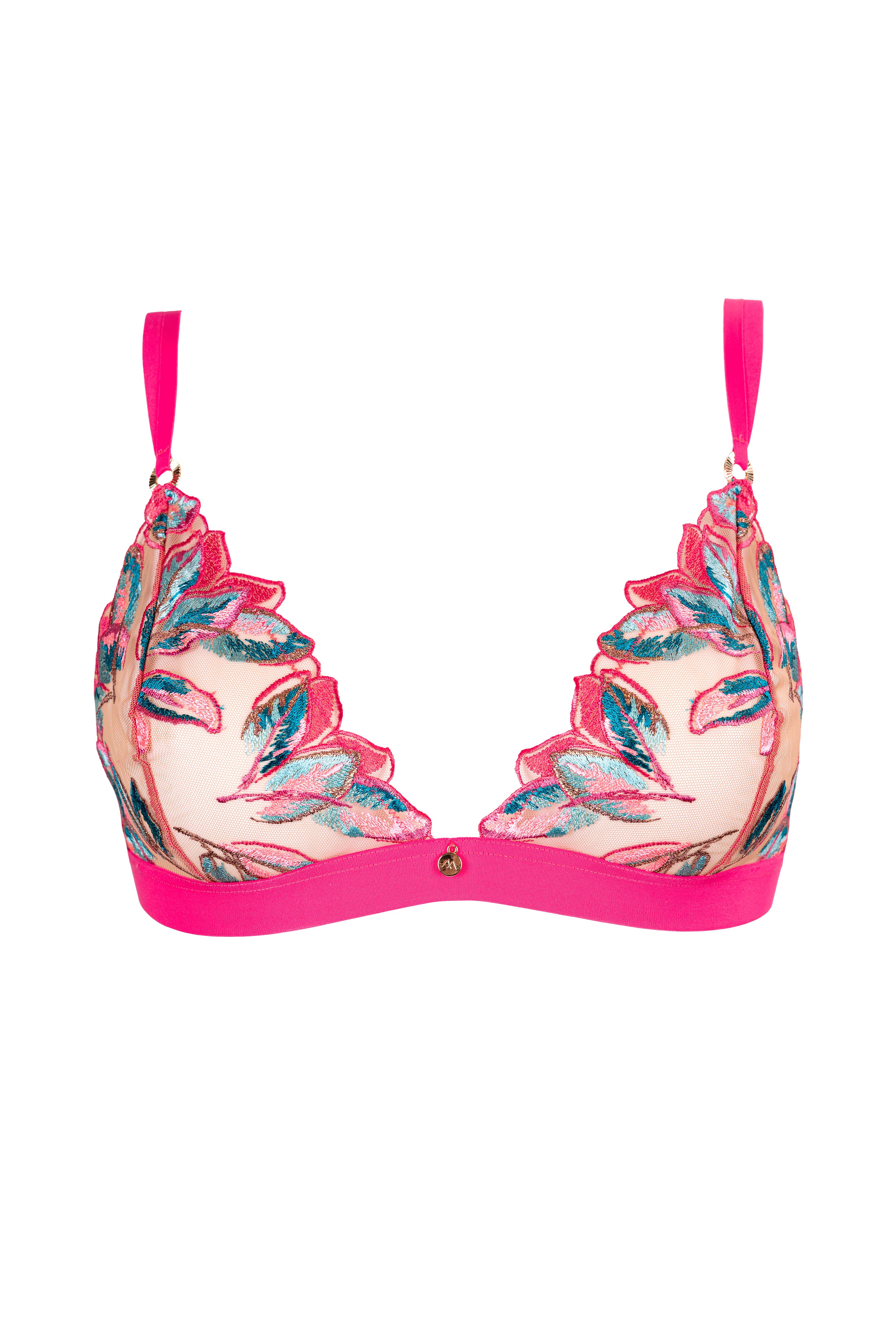De Oiseau de Paradis Triangel bh zonder beugel – Cherry verleidt met doorschijnende kersenrode tule, subtiel geborduurd met exotische bloemenmotieven. Deze driehoekige bh is ontworpen zonder beugel en biedt natuurlijk comfort, terwijl de gedurfde transparantie de buste accentueert. Fijne bandjes en Parijse details omarmen de buste op elegante wijze, waardoor het een opvallend statement-item is binnen de Oiseau de Paradis-collectie, perfect voor verleidelijke avonden.