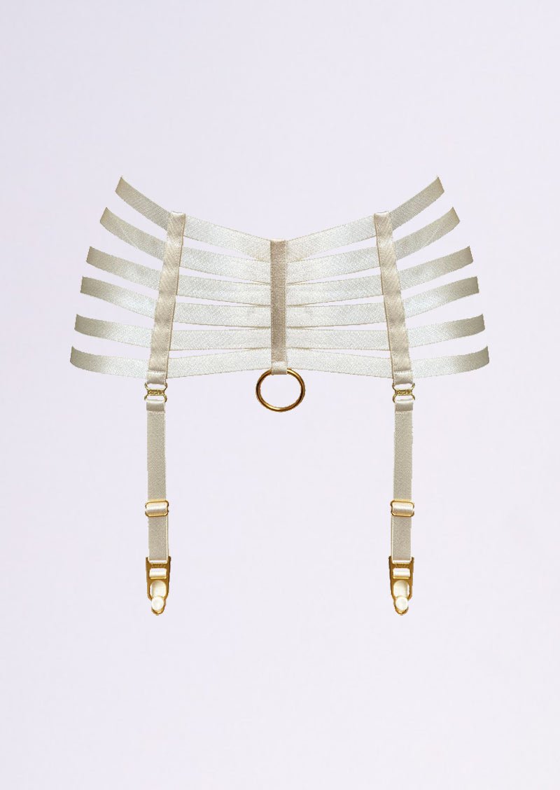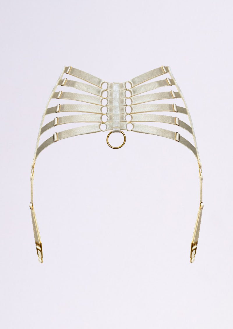 De Bondage Webbed Suspender in Ivoor verrijkt je lingerieverzameling met een verfijnd ontwerp in de iconische stijl van Bordelle. Deze verbeterde versie heeft een flatterende v-vormige taille voor een betere pasvorm. Hij bevat een 24-karaats vergulde o-ring aan zowel de voor- als achterzijde, wat een vleugje luxe toevoegt. Gemaakt van luxueus satijn elastiek, zijn de web-design banden volledig verstelbaar om een perfecte pasvorm te garanderen. Deze suspenderceintuur combineert elegantie en comfort, waardoor het een onmisbaar stuk is. Verhoog je lingerieverzameling met dit prachtige ivoorkleurige ontwerp. Ervaar de perfecte mix van stijl en verfijning. Maak een gedurfde statement met de Bondage Webbed Suspender.