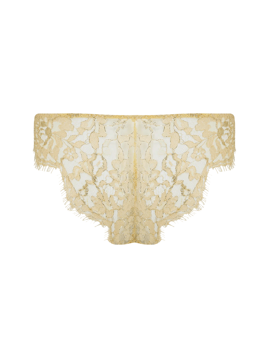 De Fiorella Brazilian Knicker straalt met zijn schitterende gouden tint een stralende sensualiteit uit. Frans Leaver-kant met glinsterende lurex siert de voorkant, overgaand in zachte elastiek en een zijden gevoerde kruis. De achterkant heeft kant met een weelderige geschulpte rand, die naadloos onder elke outfit past. Combineer met de Fiorella Balcony Bra en Suspender Belt voor onovertroffen elegantie. Vervaardigd uit gouden Leaver-kant en stralende zijde, toont Fiorella in Goud onvergetelijk vakmanschap en sensualiteit.