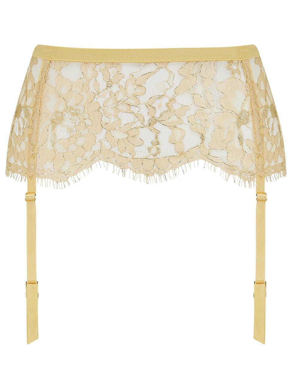 De Fiorella Suspender Belt is elegant en krachtig, en biedt het unieke zelfvertrouwen dat alleen een bijpassende lingerieset kan geven. Leaver-kant met glinsterende lurex draad wikkelt zich om het lichaam, accentueert de rondingen en onthult een adembenemende geschulpte rand. Een delicate zijden band zit in de taille, terwijl verstelbare elastische jarretelbandjes met satijnen details extra luxe toevoegen. De achterkant heeft kant ingesloten in zijden binding, en sluit met een haak- en oogsluiting. Maak de look compleet met de Fiorella Balcony Bra en Brazilian Knicker.