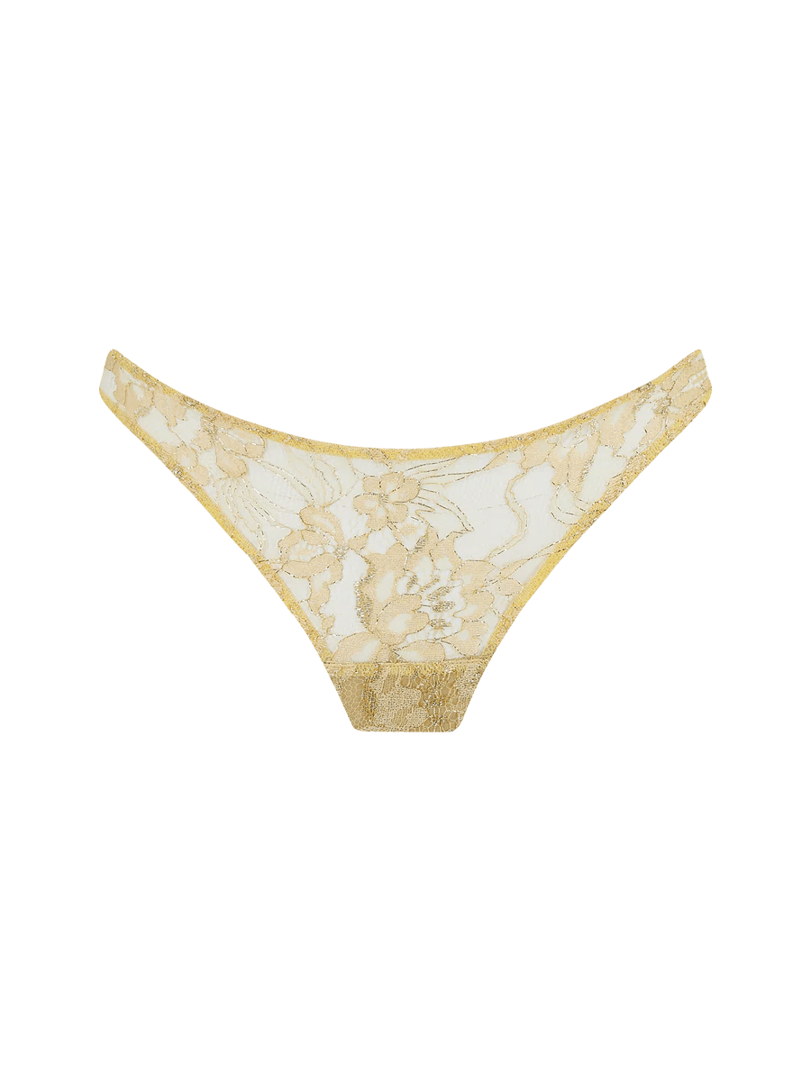 De Fiorella Thong is een elegante toevoeging aan je lingerieverzameling. Frans Leaver-kant met glinsterende lurex draad siert de voorkant, overgaand in zachte elastiek die hoog op de heupen zit en de benen verlengt. De achterkant heeft een spiegelend kanten paneel en zijden stringdetail, vastgemaakt aan de achterkant met een enkele zijden knoop, wat de sensuele aard van Fiorella verder verheft. Perfect te combineren met de Fiorella Triangle Bra.