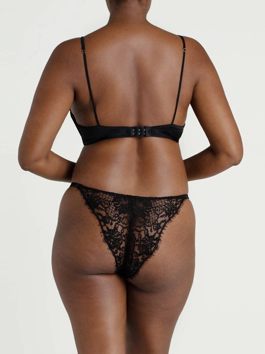 De Hera Brazilian Knicker is een klassiek verleidelijke snit, heerlijk om te dragen en betoverend om te zien. Een majestueuze omlijsting van Frans Leaver's kant en zachte zijde creëert een instant genot. De gladde lijn van het kant streelt zachtjes de billen. Laag op de heup en hoog op het been zittend, creëert de Hera Brazilian Knicker de meest ongelooflijke snit om zowel kracht te geven als te verleiden. Combineer met de Hera High Neck Balconette Bra voor een onvergetelijke impact.