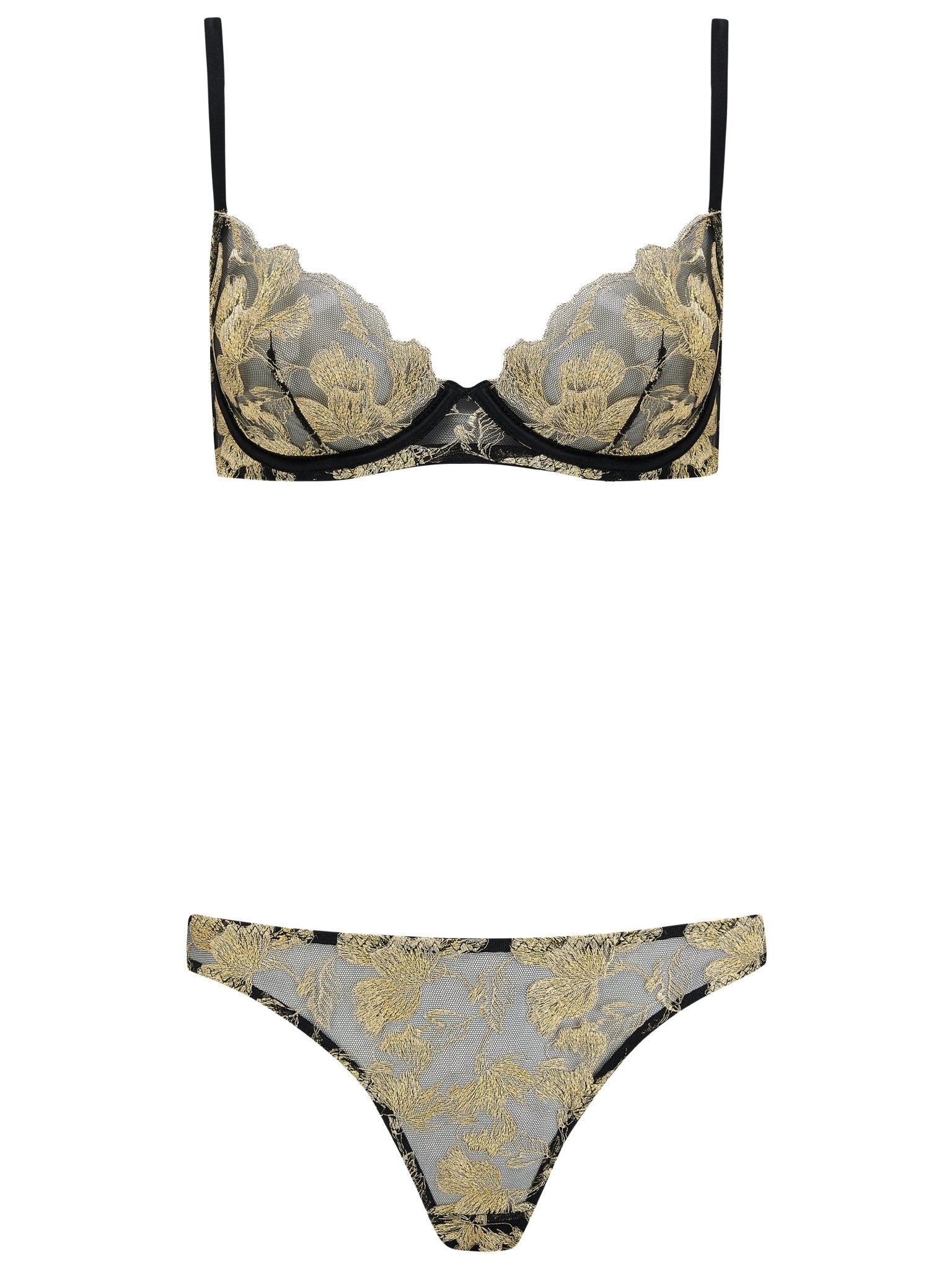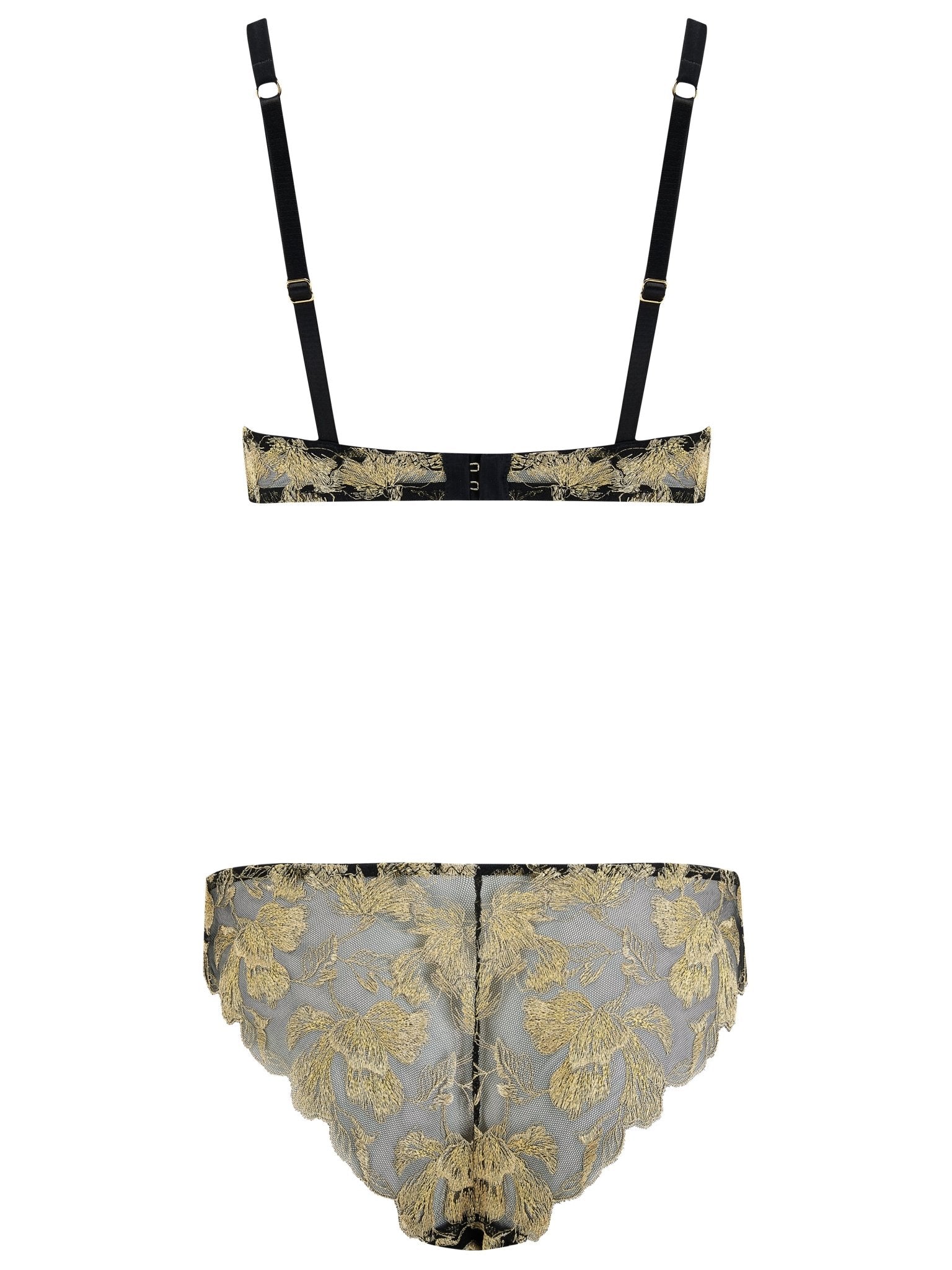 Omarm weelderige sensualiteit met de Oriana Plunge Bra. Het op maat gemaakte botanische borduurwerk valt elegant over het decolleté in een diep silhouet, perfect aangevuld door een zijden beugel. Het levendige gouden borduurwerk harmonieert prachtig met de strakke gitzwarte zijde. Deze stijl heeft een verbluffende geschulpte cup die de borsten lift en omlijst, zich om het lichaam wikkelt en bij de ruggengraat wordt vastgemaakt met een gouden haak en oog. Afgewerkt met zijden, verstelbare bandjes en gouden hardware, versterkt dit stuk de majestueuze aantrekkingskracht van Oriana. Maak de look compleet met de Oriana Brazilian Knicker voor een voortreffelijk ensemble.