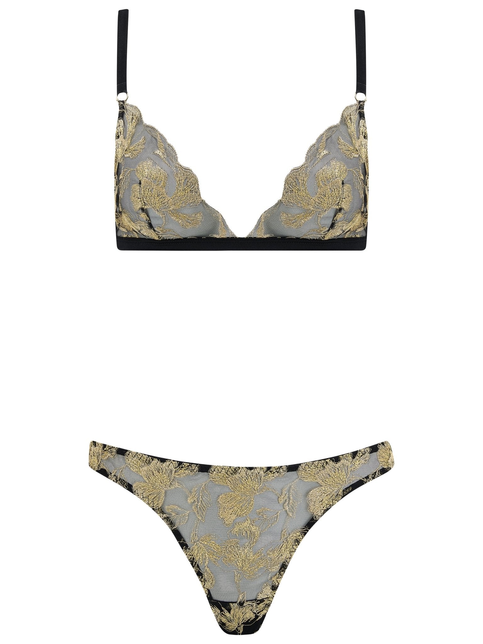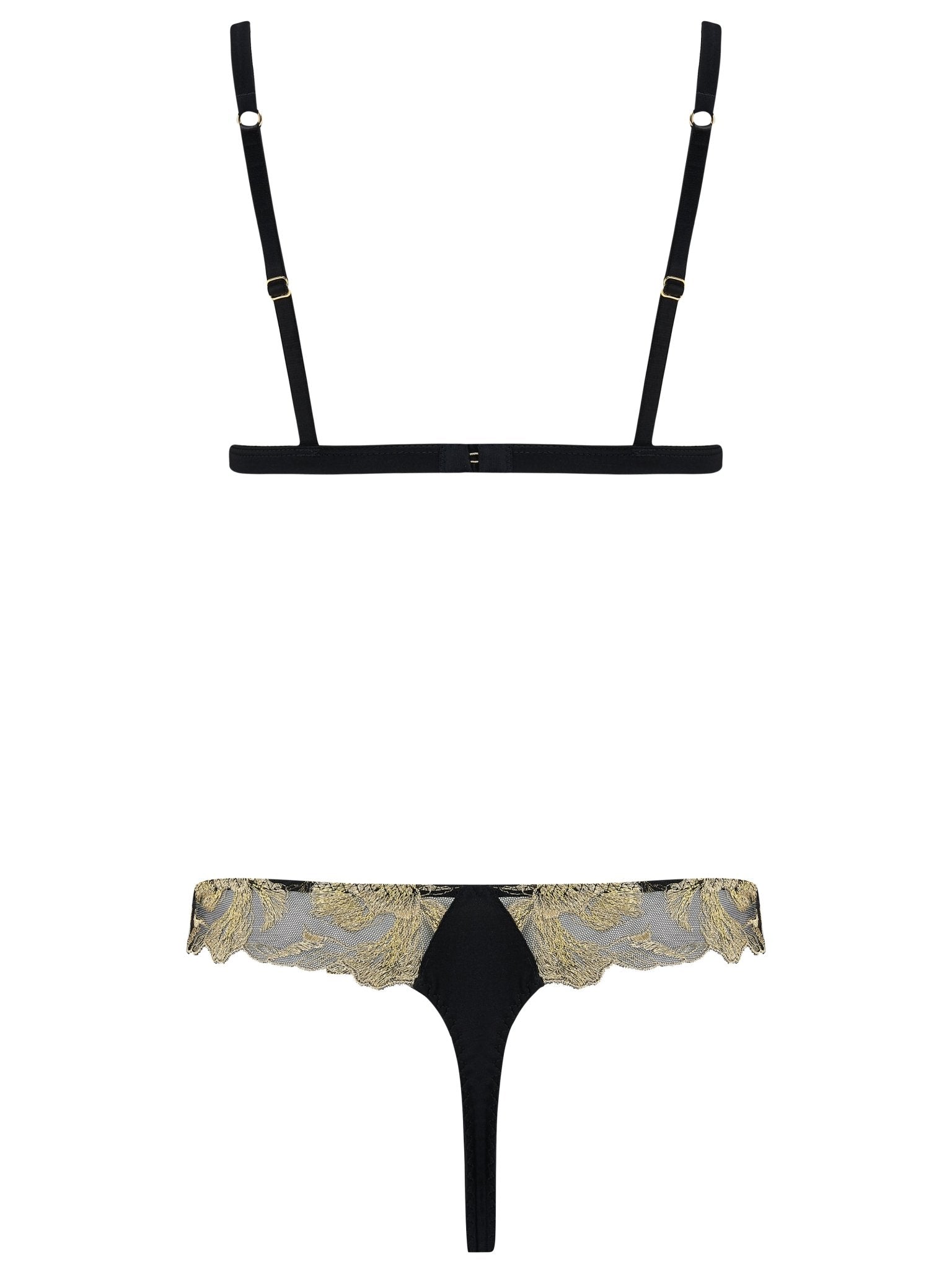 De bh is afgewerkt met verstelbare zwarte zijden bandjes en sluit met een enkele gouden haak-en-oogsluiting bij de ruggengraat. Hij past perfect bij de Oriana Thong voor een stijlvolle en comfortabele look.