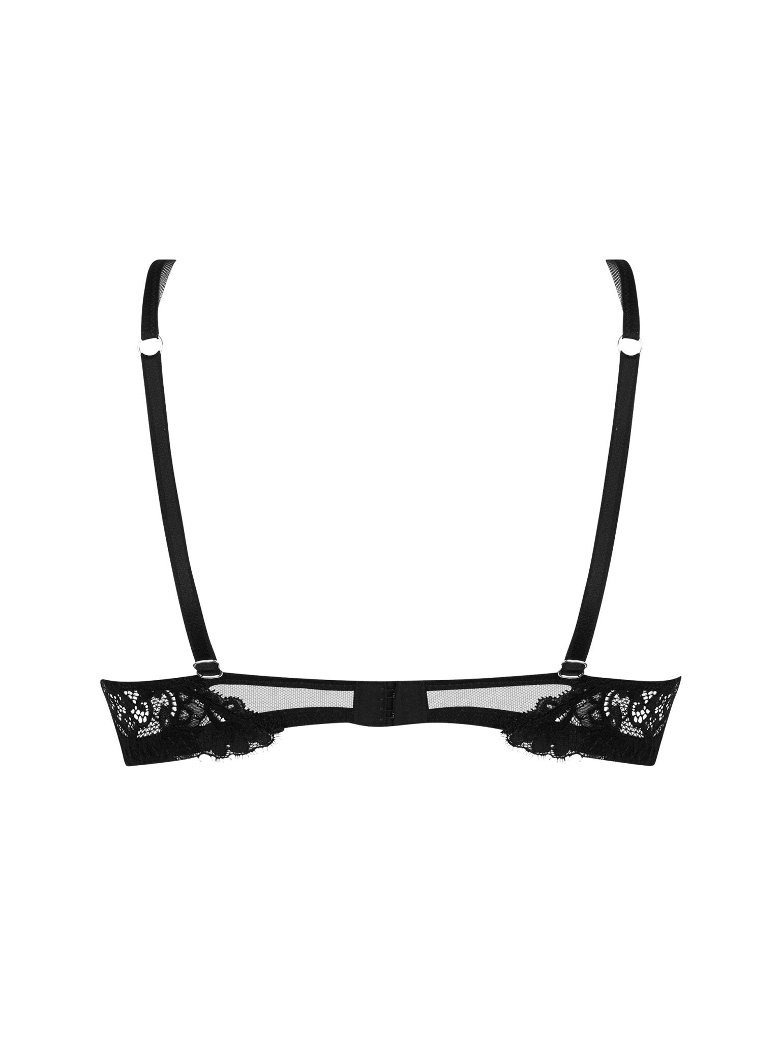 Deze glamour BH heeft cups van cristal tulle, intricately versierd met kant, rustend op delicate satijnen veters. De onderkant van de cups is gemaakt van bijpassend kant voor een samenhangende uitstraling. De basque toont prachtig kant met een insnijding in tulle, versierd met een goudkleurig strassjuweel aan de voorkant, wat een vleugje sparkle toevoegt. De rug is verrijkt met een inzetstukje in tulle en een fijn kanten randje, wat het totale ontwerp verfraait. Perfect voor wie elegantie en verfijning zoekt in hun lingeriecategorie.