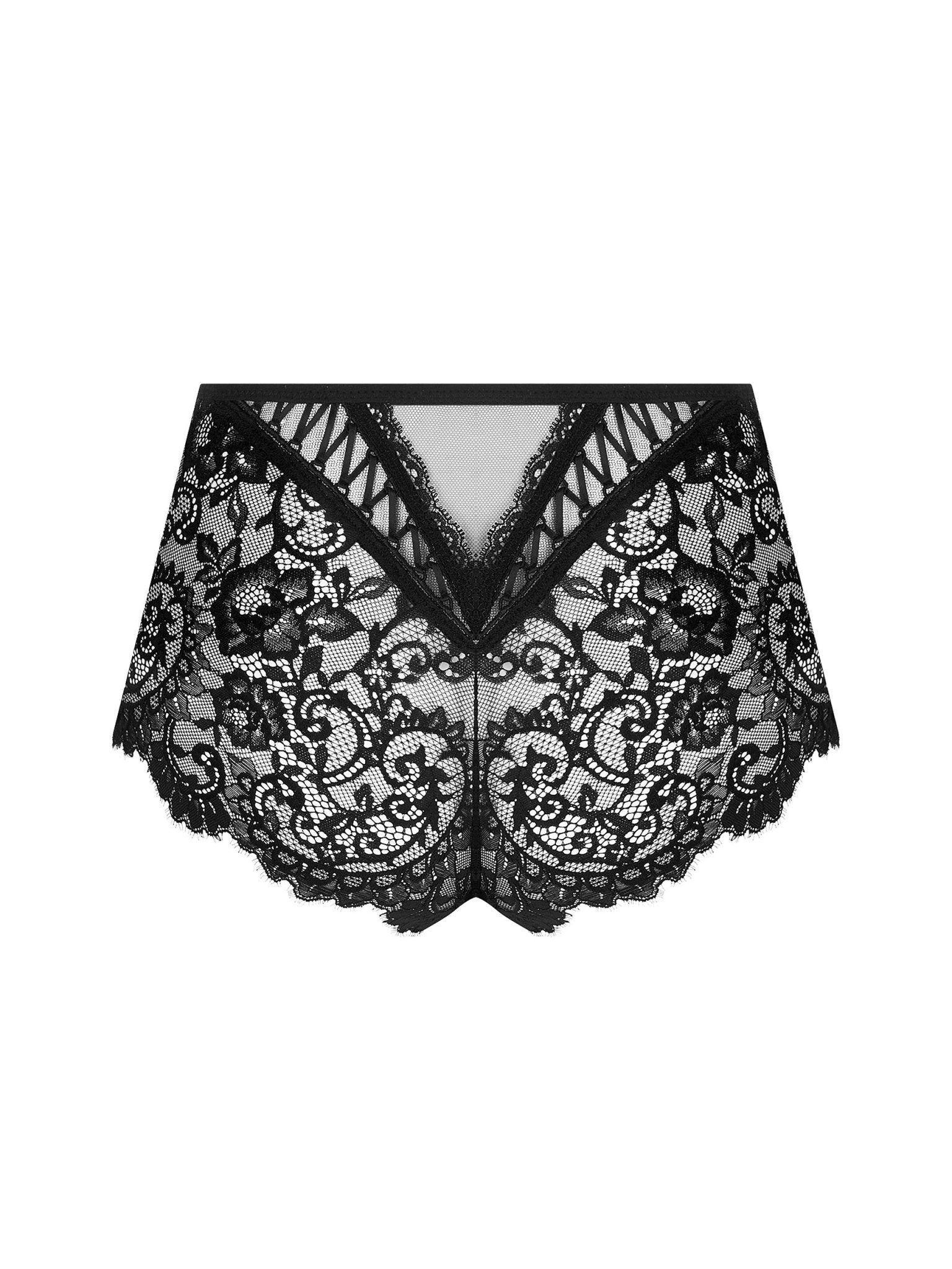 Dit verleidelijke lage taille model onthult subtiel de billen en omhult de zijkanten. De hoge taille shorty is versierd met uitgewerkt kant aan de dijen, zowel voor- als achteraan. Voorin biedt het ontwerp een speelse transparantie met kant op tulle, verrijkt met een geraffineerd laddertje en een fijn kanten randje. Achteraan laat een driehoekige insnijding twee delicate veters zien, samen met een tullen driehoekje, omrand met een fijn kanten boordje. Dit stuk biedt een perfecte balans tussen allure en verfijning in lingerie.
