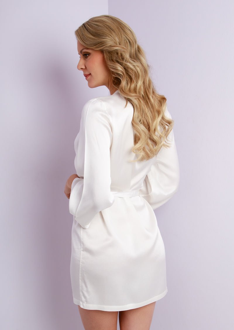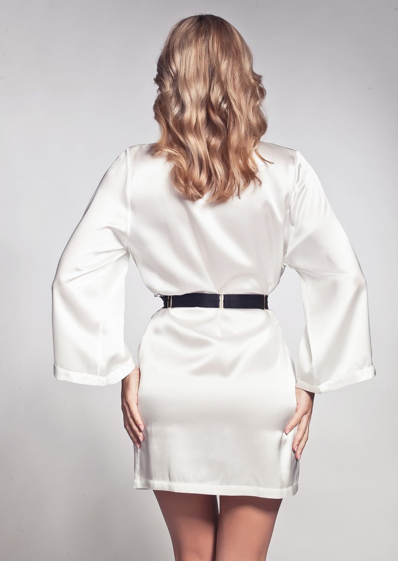Op zoek naar iets nieuws voor je huwelijksnacht? De Marjolaine Laser Kimono in ivoor is de perfecte zijden jurk voor je huwelijksnacht. Deze zijdezachte korte kimono met een handig zakje ziet er prachtig uit op bijna alles. Of je de Marjolaine Laser Kimono nu naakt draagt of met prachtige luxe lingerie, een kanten bodysuit of de verleidelijke Marjolaine Oda Slipdress, je zult absoluut een blijvende indruk achterlaten.