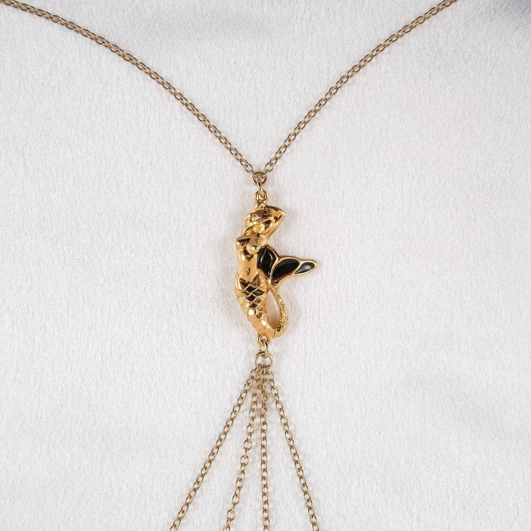 Een sirenenzang op de huid… De Song of Mermaid borstketting in stralend goud siert de buste met sensuele maritieme motieven. Geïnspireerd door mythische zeemeerminnen, roepen de glinsterende emaille details mysterie, allure en oceanische elegantie op. Elke beweging onthult een lichtgevende fonkeling, waardoor intimiteit wordt getransformeerd tot een luxueuze uiting van vrouwelijkheid en verlangen.