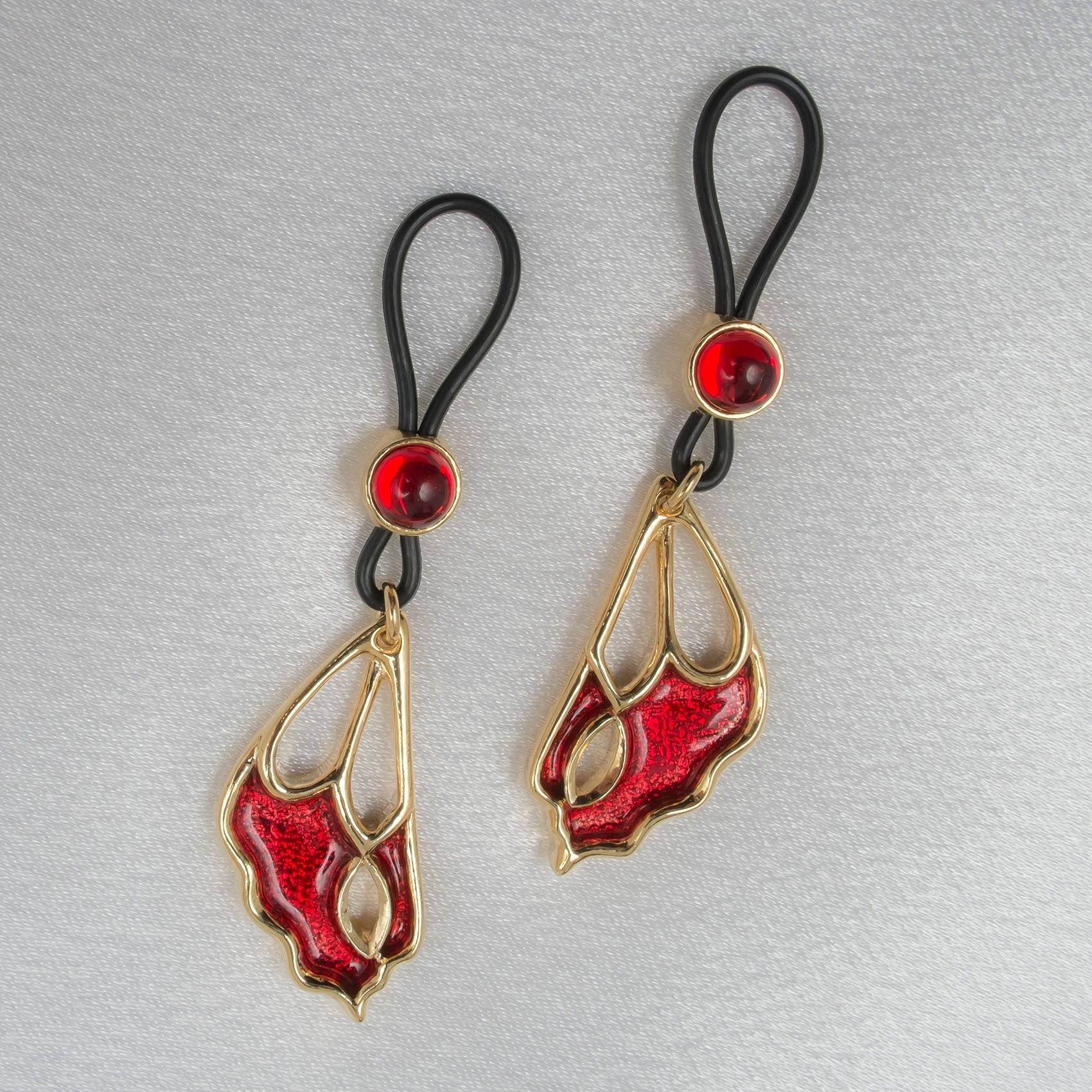 Tepelpiercing met een ontwerp van twee rode vlindervleugels.