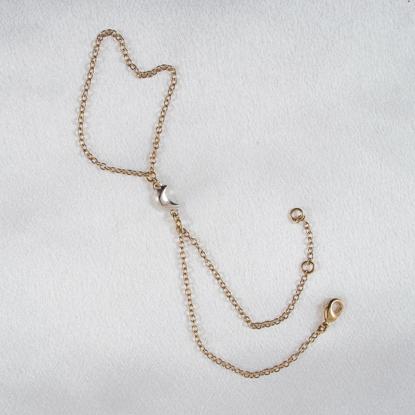 Dit verstelbare handsieraad is vervaardigd met een ketting van 1 micron 16-karaats goud, afgewerkt met 24-karaats glans en versierd met een zilveren bedeltje met een 10 micron laagje op metaal. Hypoallergeen, comfortabel en duurzaam: het is meer dan een accessoire – het is een statement van elegantie en mystiek.