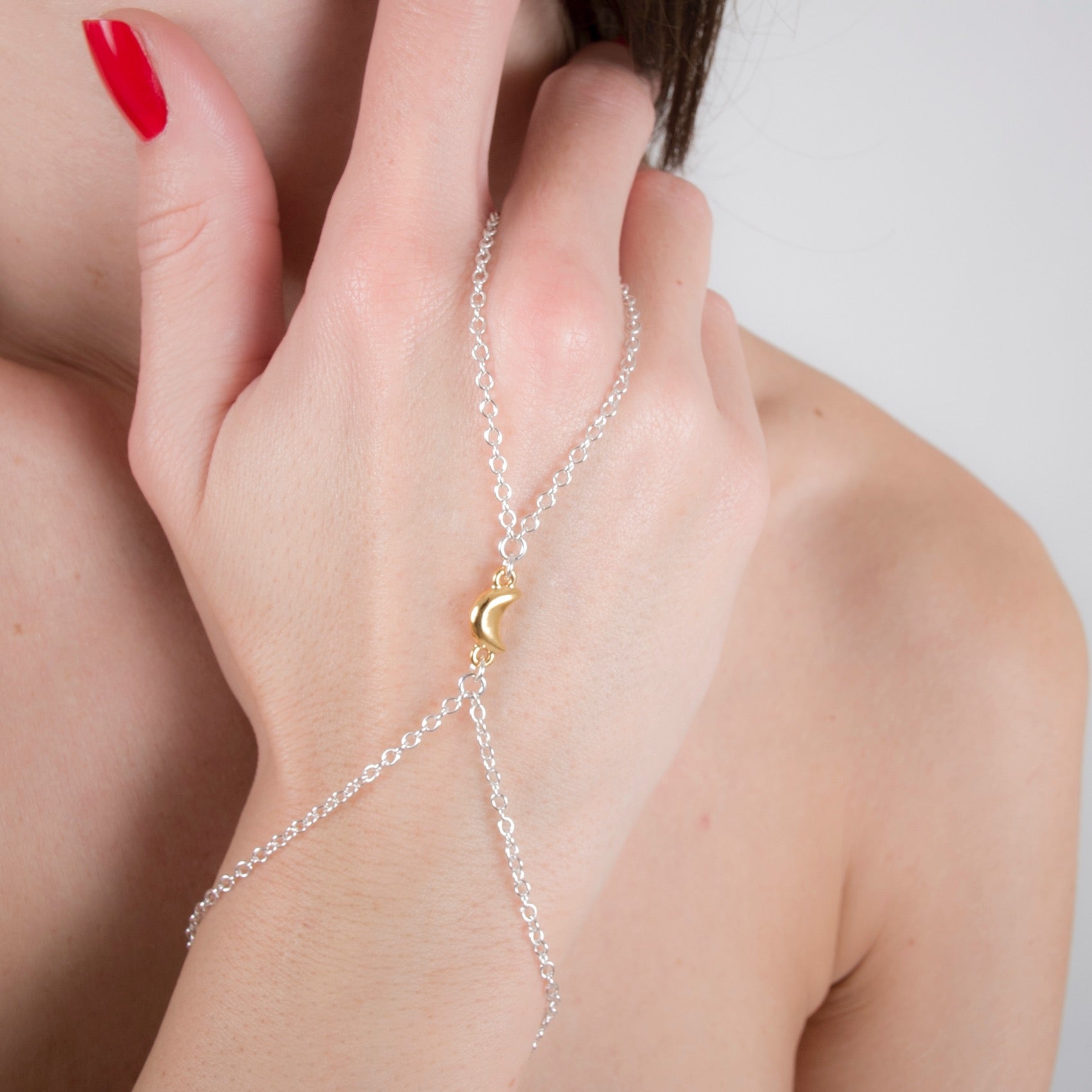 Een zilveren ketting wikkelt zich sierlijk om je vinger en omarmt je pols, terwijl een gouden halve maan bij elke beweging fonkelt. De charme schuilt in de tweekleurige harmonie: koel zilver ontmoet warm goud in een delicate dans van licht en elegantie.
