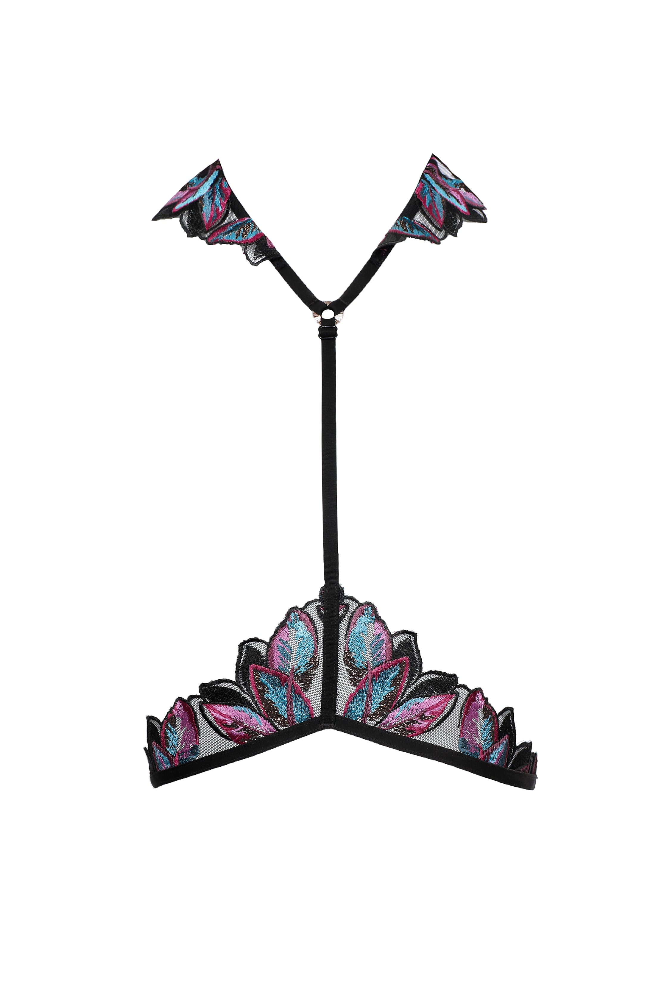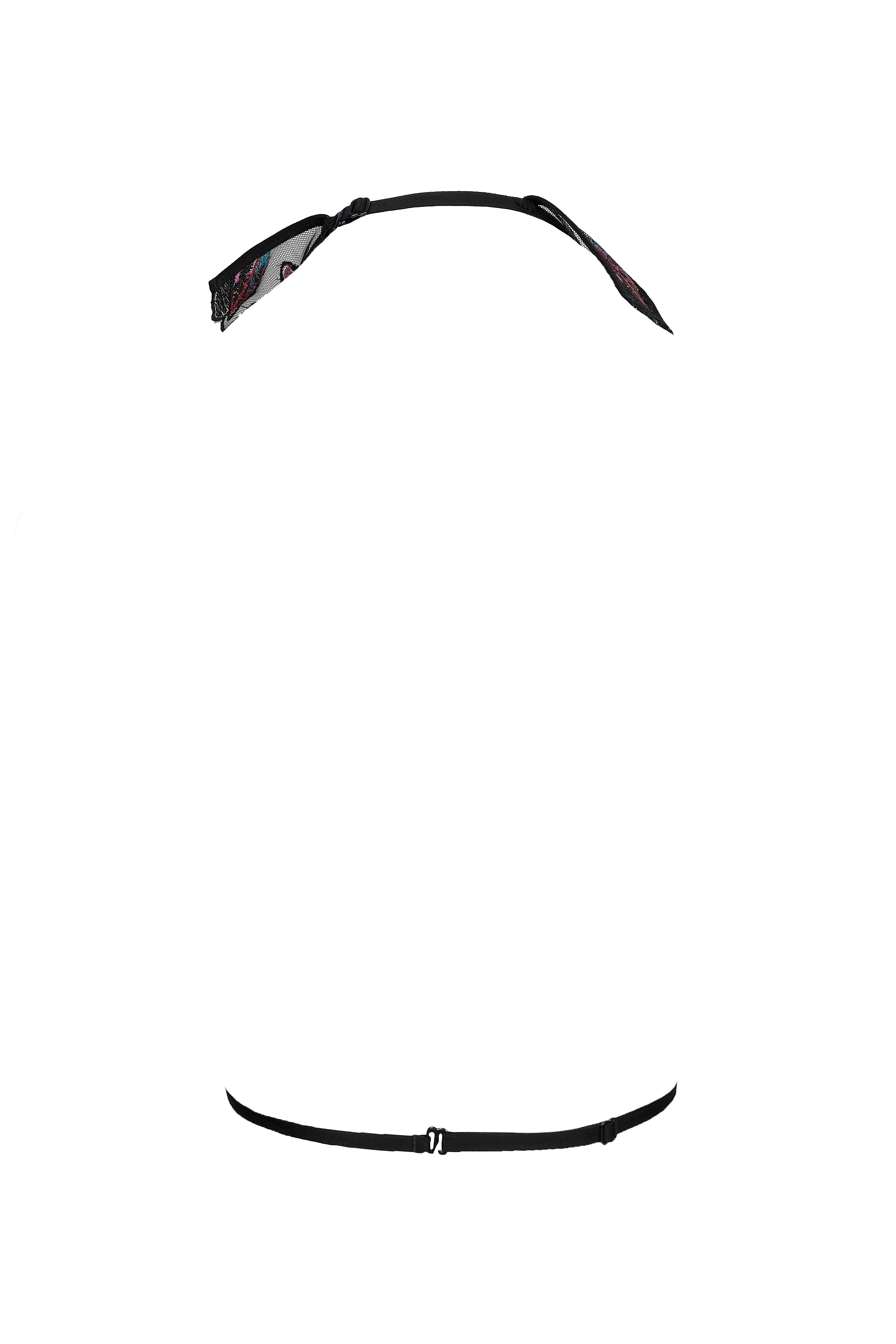 Oiseau de Paradis Harness – Black seduces with sheer black tulle delicately embroidered in exotic floral motifs. Designed with adjustable straps and refined detailing, this harness embraces the body with daring transparency and Parisian elegance. Luxurious fabrics and exquisite craftsmanship make it a bold statement piece within the Oiseau de Paradis collection, perfect for nights of allure.